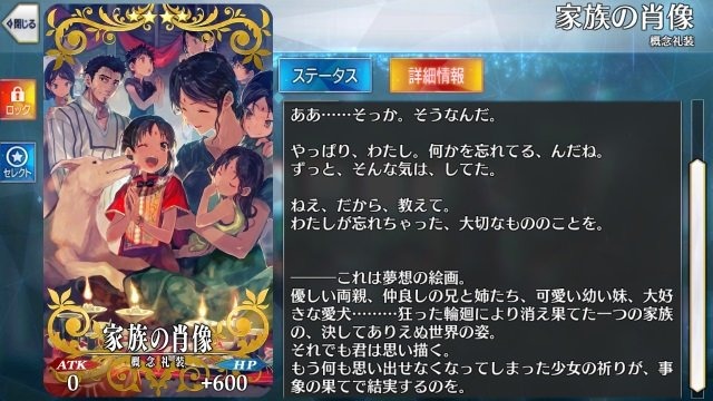 この親子に関して最も強く感情を揺さぶられた場面といえば、クリア後に入手できた礼装「家族の肖像」を見た時でしょう。ユガによって消される前は大家族だったこと、大切な家族が消されてもはっきりと気付けないこと……「アジャイ」が基本イライラしているように見えたのも、これらの違和感で頭がモヤモヤしていたからかもしれないと考えてしまいます。