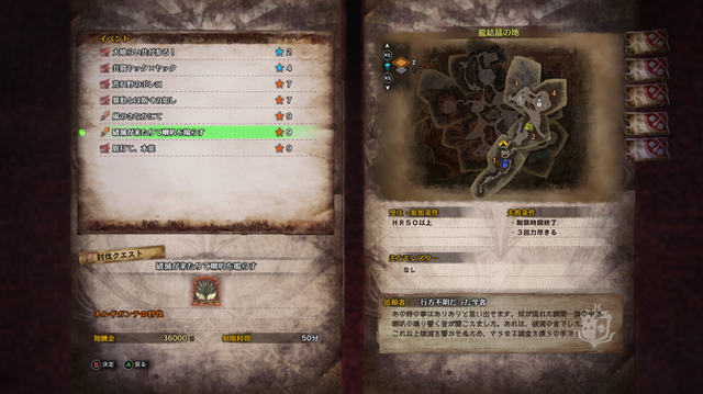 特別任務「烈日」から始まる3つのクエストをクリアすることでフリークエストが解放されます。完結編となる「平伏するより他に無し」は、テオ・テスカトルとナナ・テスカトリの同時狩猟が目標。強烈な古龍2体が相手となるクエストですので、火耐性を上げる、防御力の底上げをする、など対策をしておくといいでしょう。
