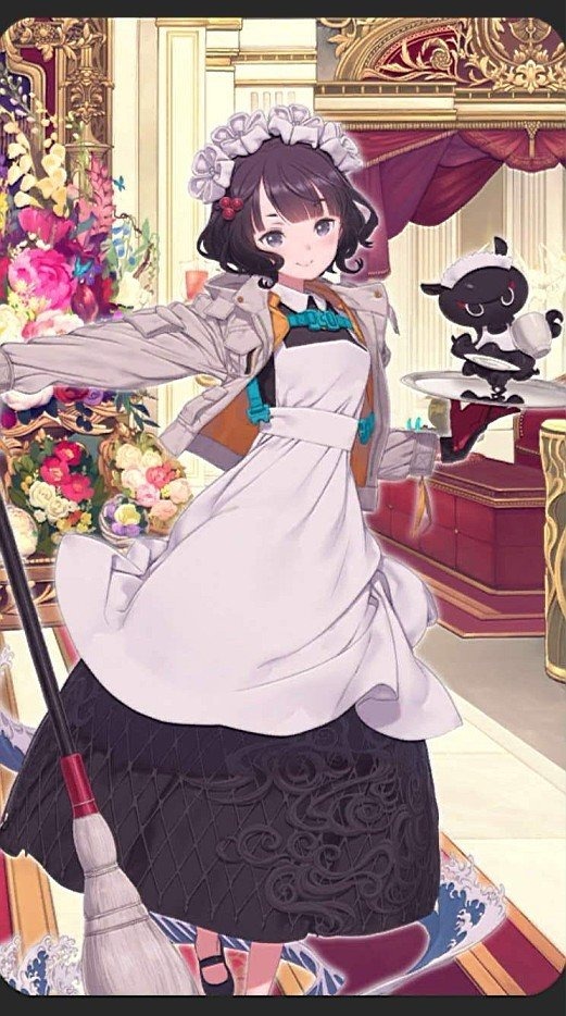 そして、メイド風な英霊祭装の「葛飾北斎」は、洋装ながらも和洋折衷なデザインで、彼女の魅力を大きく引き立てています。足元のうねる波も、彼女らしさを感じさせる点です。左手のお盆には、こちらもメイド風のとと様が。実に見どころの多い一枚です。