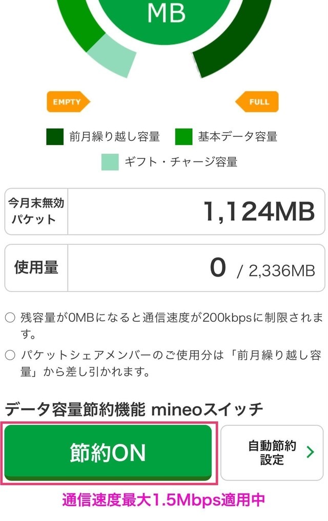 そんなユーザーから支持を集めているのが、オプションサービスの「パケット放題 Plus」だ(※2)。これは、その名の通りに月額385円(税込/※1)で、データ通信がし放題になるというもの。利用時には公式アプリやサイトで「mineoスイッチ」を切り替えることで、通信速度が最大1.5Mbpsになる代わりに、「1GB」や「5GB」といった契約しているギガが減らなくなる。最大1.5Mbpsというと、「回線速度が遅いのでは?」と思ったのだが、スマホでサイトや動画を観る分にはほとんど不自由さは感じない。