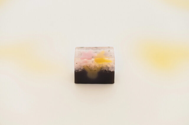 春といえば桜の花。練り羊羹のベースに関西の桜餅の特徴である道明寺を層で重ね、その上に羊羹でできたピカチュウとチェリム(ポジフォルム)を並べられています。
