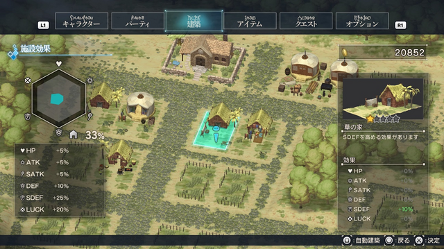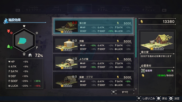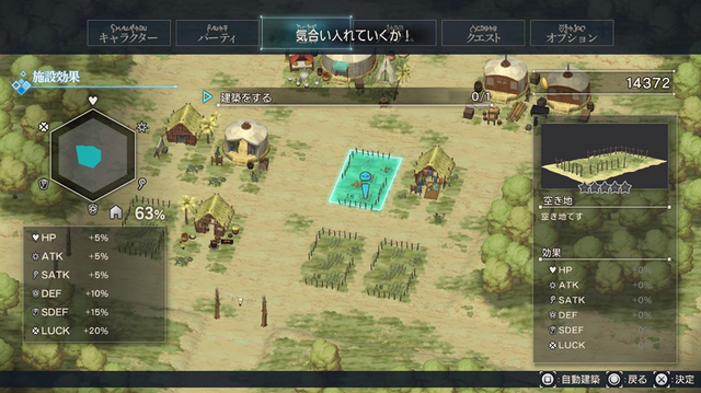 拠点となる村の空き地に好きな建築物を建てることができるのですが、何を建てるかによって恩恵が変わってきます。