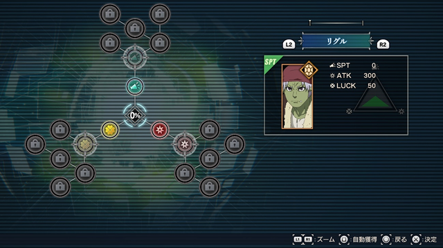 本作はバトル報酬やクエスト報酬で得られるGPを消費し、「潜在能力」と呼ばれるスキルを開放することでキャラクターを育成します。
