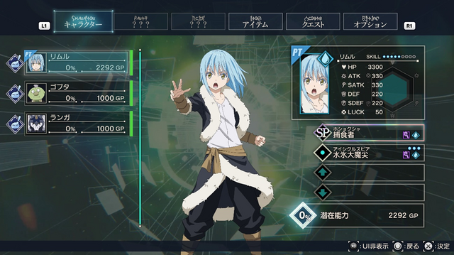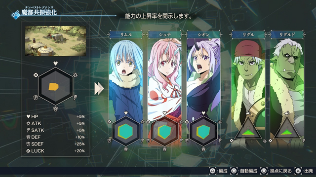 最初の戦闘ではリムルひとりで出撃することになりますが、2回目以降はパーティを組むことが可能に。最終的には交代可能なプレイアブルキャラクター3名+サポートキャラ2名で編成することになります。