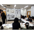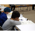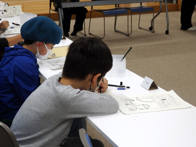 席には筆記用具のほか、マンガの描き方の説明書も。もちろん、文章ではなくマンガでわかりやすく解説している。用意されていた用紙も、実際の原稿と同じものを使用。少しマンガ家に近づいたような気分になれそうだ。難しいな……と感じている雰囲気の生徒がいても、そばにはプロとして活動しているマンガ家の先生がついているため、アドバイスをもらいながら描き進められる。先生は「何より楽しんで描いてくださいね」と語っており、生徒たちの原稿には、試行錯誤した消しあとを残しつつも、活き活きとしたキャラクターの姿が垣間見えた。