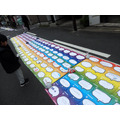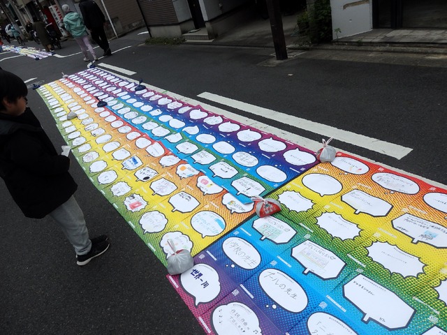 公園を出たトキワ荘通りでは、豊島区のゆるキャラが登場。また、道路には人々の夢を描いたシートによる「夢の虹」が広がっていた。たまたま通りかかった人も「どんな夢があるんだろう」と立ち止まったり、自分が描いたシートを探す子どもたちなど、虹の周りに和気あいあいとした雰囲気に包まれていた。さまざまな夢があふれていたが、やはり豊島区だからなのか、イラストレーターや声優という夢が多く目についた。