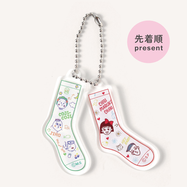 このコラボソックスを含む¥2,750(税込)以上購入した方に、先着で『ちびまる子ちゃん』と『コジコジ』の靴下型キーチェーンが1つプレゼントされる。