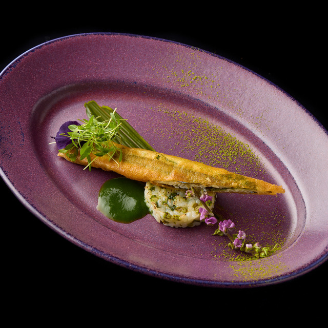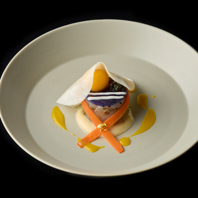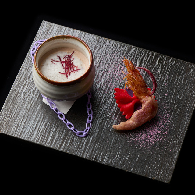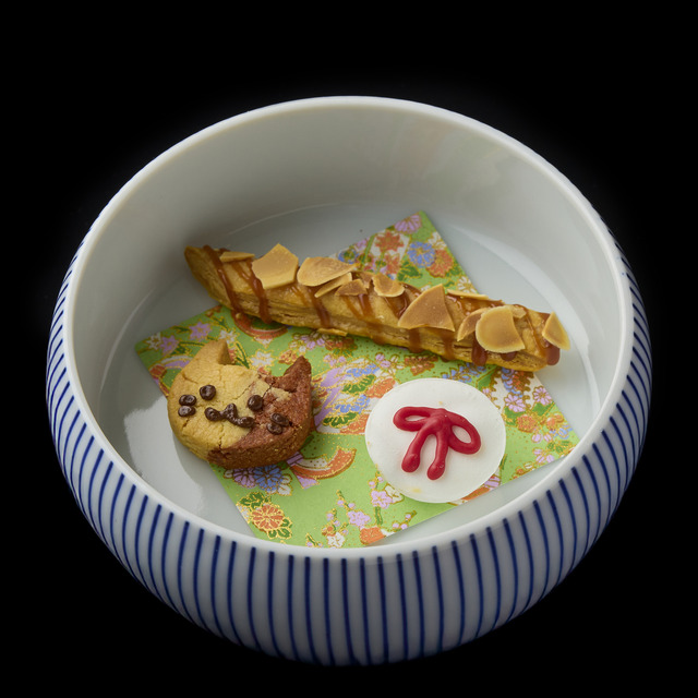 特別コースは、後藤藤四郎をイメージした「ヴィシソワーズ(紫芋・カカオ)」からはじまり、南泉一文字をイメージしたお茶菓子「ギモーヴ、ポルボロン、フロランタン」までの全8品で構成。