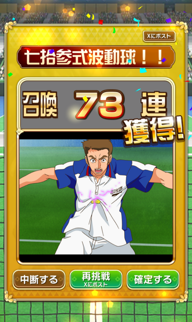 その連打結果によってアニメ『新テニスの王子様』のさまざまな場面写真が表示されるのだが、何の場面写真かというと、「波動球」といえばの河村 隆と石田 銀。「波動球」を繰り出すシーンはもちろん、石田の放った「波動球」によって吹っ飛ばされるタカさんの姿も。この連打結果は自身のXに投稿できるので、ぜひ「こんなタカさんが出た!」と共有してほしい。……波動球だけでこんなに場面写が見られるコラボが『コトダマン』以外であるだろうか。