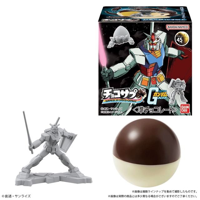 「チョコサプ 機動戦士ガンダム」は、ミルク味チョコとホワイトチョコ、2色のチョコカプセルの中から、フィギュアなどのサプライズ(おまけ)が出てくる食玩「チョコサプ」シリーズの『機動戦士ガンダム』商品として登場する。メカの硬質感をイメージし、フルABS製で立体化されたMS(モビルスーツ)が封入されるのが見どころだ。