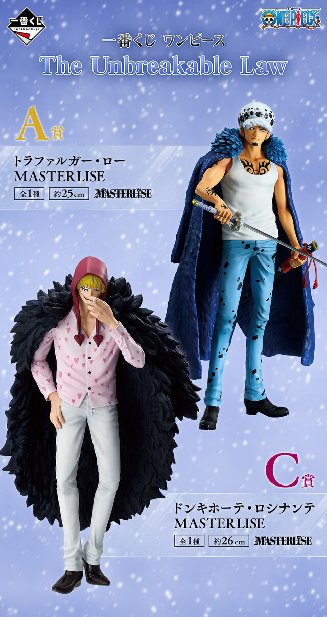 今回は上位賞のフィギュアが先行公開。トラファルガー・ロー、ドンキホーテ・ロシナンテ、ベポ、ドンキホーテ・ドフラミンゴ、さらに女体化した「ロー(チェンジver.)」がボリュームのあるMASTRELISEシリーズで立体化されています。