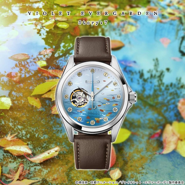このたびの「ヴァイオレット・エヴァーガーデン×セイコー 機械式腕時計」はそんな本作より、隣国へ嫁ぐ王女・シャルロッテの「公開恋文」の代筆を通じて同じ年頃の少女の恋心に触れる第5話をイメージした「Story:5」、人気戯曲家・オスカーの執筆を手伝い最愛の娘を亡くした深い悲しみと孤独に寄り添う第7話をイメージした「Story:7」という、各ストーリーの美しい情景と想いが込められた2モデルとなる。