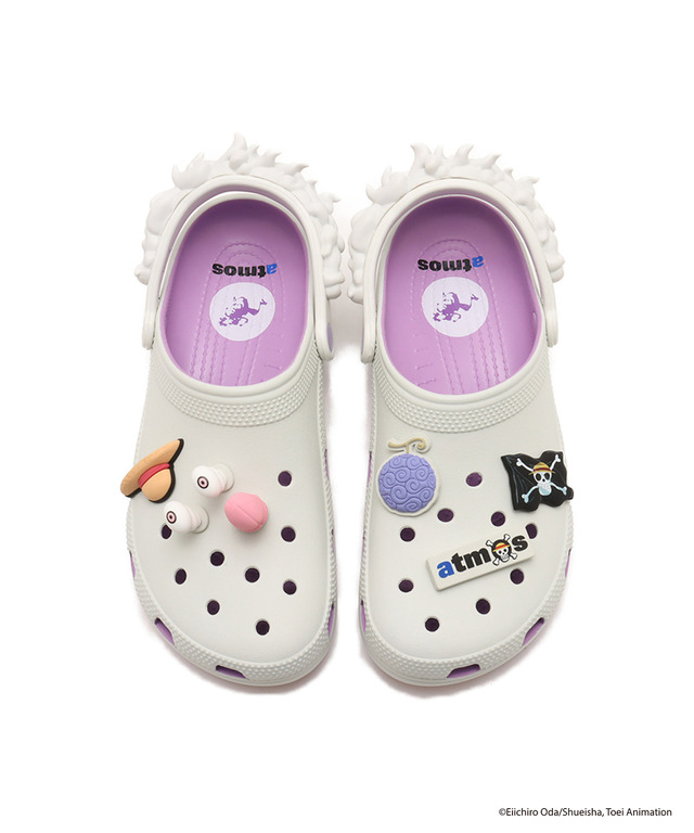 そんな本作と「atmos」、「クロックス」のトリプルコラボレーションによるこのたびの「ワンピース×アトモス×クロックス ギアファイブ クラシック ラバーアウトソール クロッグ」は、主人公モンキー・D・ルフィが到達したギア5の自由、笑い、そして“解放”を象徴する、ユニークで大胆なデザインの限定クロッグだ。ゴムのように自在に体を伸ばし、戦いの最中でも楽しそうに笑う、“自由で楽しく、強い”ルフィの姿がモチーフになっている。
