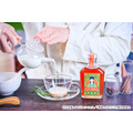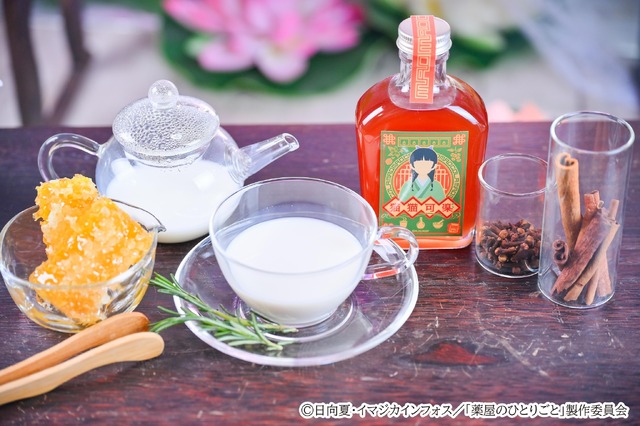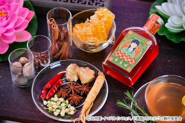 また、美容や健康増進、疲労回復、むくみ解消が期待できるビタミン・ミネラル豊富な百花蜂蜜が贅沢に使用されている。冷え性に効果があるとされる、生姜や高麗人参といった厳選素材も加えられた。薬瓶をイメージしたボトルには、作品のモチーフが散りばめられたラベルとボトルシールが施されており、観賞品としても堪能できる。ぜひ、部屋に飾って楽しみたい。