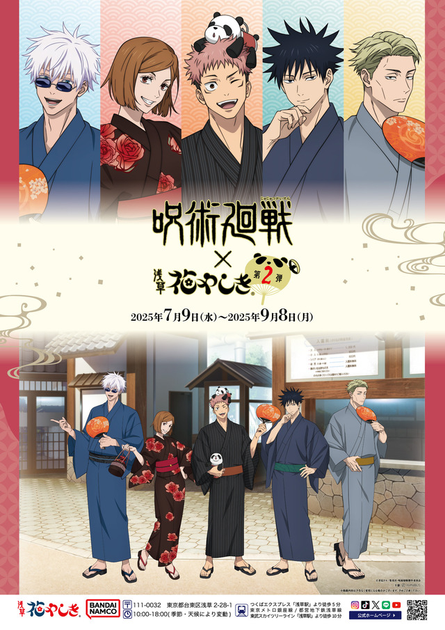 虎杖悠仁、伏黒恵、釘崎野薔薇、七海建人、五条悟が、浅草花やしきに浴衣姿で集合する。コラボイベント「呪術廻戦 × 浅草花やしき 第2弾」のスペシャルチケットやオリジナルグッズが発表された。開催期間は7月9日~9月8日だ。
