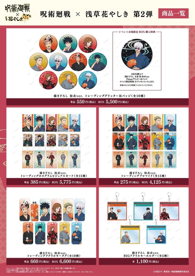 イベント会場のほか、通販サイト「AMNIBUS(アムニバス)」&「ARMA BIANCA(アルマビアンカ)」&「アニメイト」でも先着特典グッズ「描き下ろし 虎杖悠仁 浴衣ver. 75mmグリッター缶バッジ 限定特典」を用意する。
