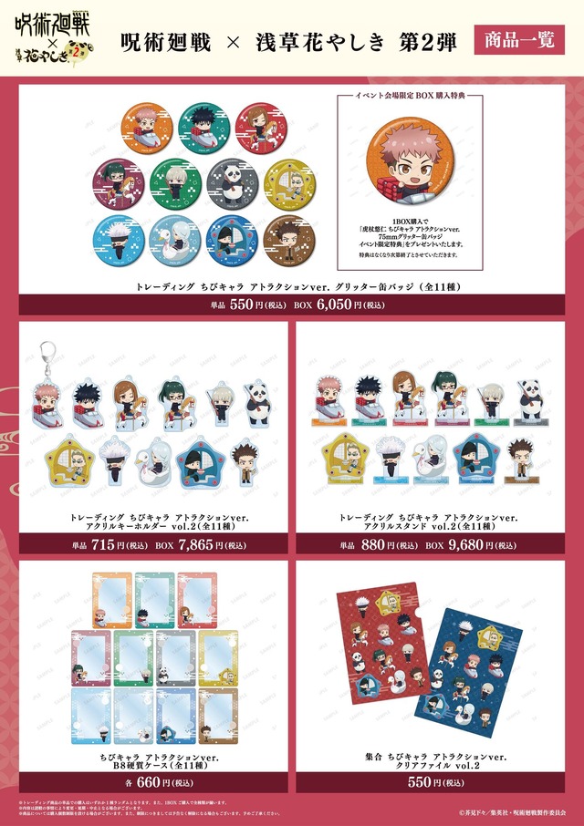 「描き下ろし 浴衣ver. トレーディンググリッター缶バッジ」「トレーディング ちびキャラ アトラクションver. グリッター缶バッジの2アイテムは、1BOX購入につき1点、先着で特典グッズ「描き下ろし 五条 悟 浴衣ver. 75mmグリッター缶バッジ 限定特典」をプレゼント。