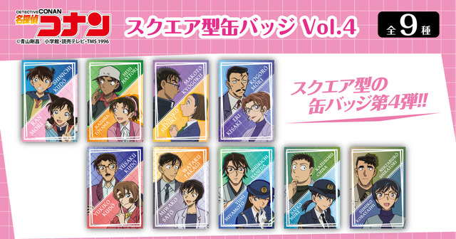 「スクエア型缶バッジ」は、Vol.3は江戸川コナン&怪盗キッド・工藤新一&服部平次・ジン&ウォッカ・赤井秀一&世良真純・降谷零&風見裕也・大和敢助&上原由衣・宮野志保&宮野明美・諸伏景光&諸伏高明・萩原研二&萩原千速の全9種、Vol.4は工藤新一&毛利蘭・服部平次&遠山和葉・京極真&鈴木園子・毛利小五郎&妃英理・工藤優作&工藤有希子・高木渉&佐藤美和子・羽田秀吉&宮本由美・千葉和伸&三池苗子・白鳥任三郎&小林澄子の全9種がそれぞれ用意された。