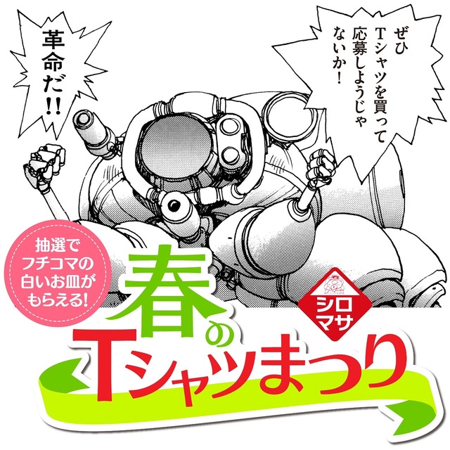 その東京会場では現在、「春のシロマサTシャツまつり」が開催中だ。展覧会オリジナルTシャツを3枚以上購入すると、抽選で“革命的にオリジナルな”「フチコマのお皿」が当たるSNS企画が行われている。30種以上のTシャツが並ぶ、士郎正宗ファン必見の企画となる。