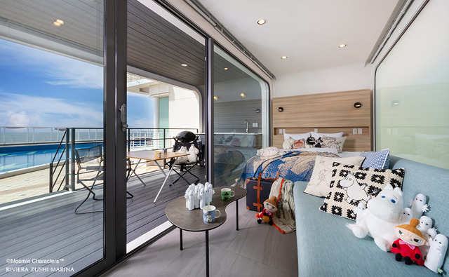 室内には、ムーミン谷のキャラクターのアートやアイテムがゲストを迎える空間が施され、リビエラ逗子マリーナでしか手に入らない限定ムーミングッズも付く。ムーミンたちが過ごしたリゾート地“リビエラ”に思いを馳せながら、非日常のひとときを過ごせる。