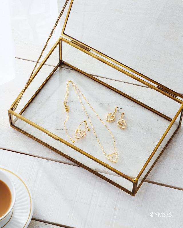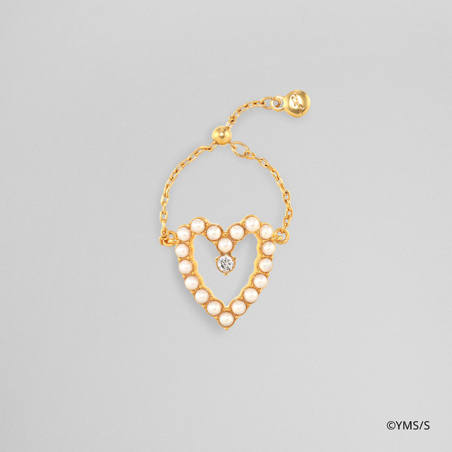 そしてHACHI ー 小松奈々モデルは、小さなパールでかたどった、オープンハートが揺れるピアスが登場。キュービックジルコニアとK18イエローゴールドコーティングのコントラストが、顔周りを華やかに、ハッピーな表情を引き出してくれる。