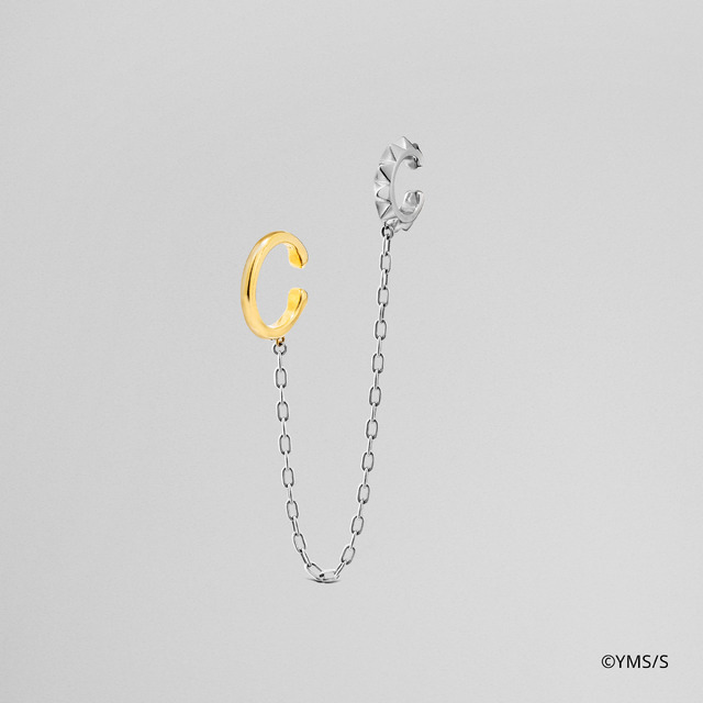 薔薇の棘を想起させる「スパイク」をあしらったチェーンを一周フープにしたユニセックスなキャッチレスピアスは、「スパイク」部分にK18イエローゴールドコーティングが施された。程よい華やかさとチェーンの抜け感がハードすぎず、軽やかに着用できる。