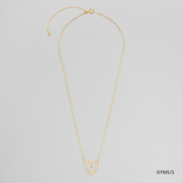 小さなパールでかたどったハートの中で、キュービックジルコニアがきらりと輝くネックレスは、程よく肌に馴染む。こちらもスライドアジャスターを用いているので、その日の装いに合わせて長さの調整ができる。