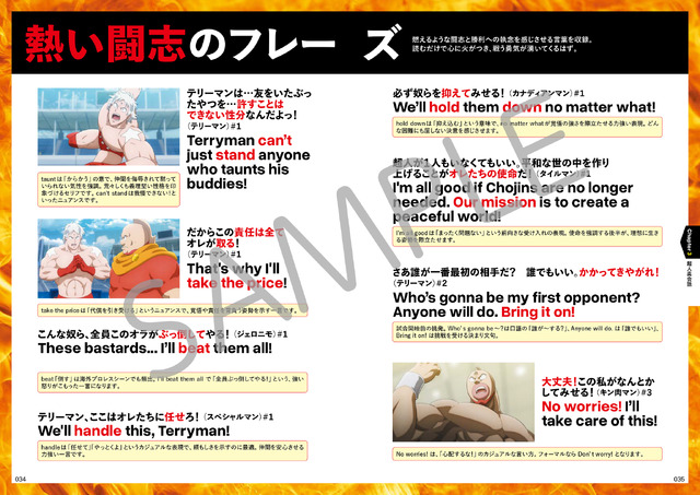 例えば「Chapter 1 超人英語File」では、キン肉マンの「へのつっぱりはいらんですよ」の英語を紹介。「Chapter 2 名言で味わう英語フレーズ」では「テリーマンは…友をいたぶったやつを…許すことはできない性分なんだよっ!」という熱い闘志のフレーズを英訳しつつ日常会話に応用できるポイントを解説している。