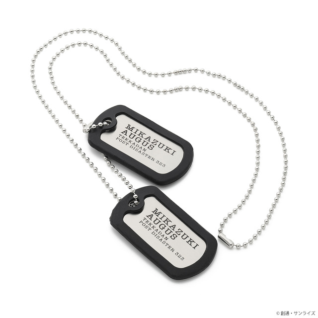 三日月・オーガスモデルのドッグタグも販売。フチを守るゴムのサイレンサーが付いており、2枚セットでボールチェーンが付属する。