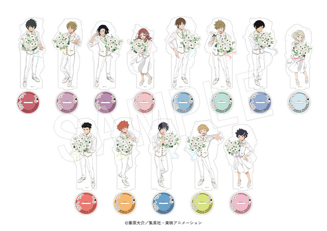 「Bouquet ver.」の第2弾では、白い衣裳に身を包んで白い花束を抱えたボーダー隊員たちを描き下ろした。「アクリルフィギュアスタンド Bouquet ver.2」は全13種類で、ラインナップは太刀川慶、出水公平、唯我尊、国近柚宇、二宮匡貴、犬飼澄晴、辻新之助、氷見亜季、生駒達人、水上敏志、隠岐孝二、南沢海、細井真織。価格は1,870円だ。