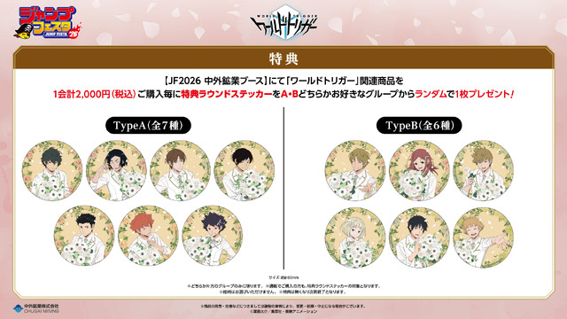 特典として「ジャンプフェスタ2026」もしくは「Chugaionline」で関連商品を1会計2,000円購入ごとに、特典ラウンドステッカーをA(全7種)とB(全6種)の、どちらか好きなグループからランダムで1枚プレゼントされる。