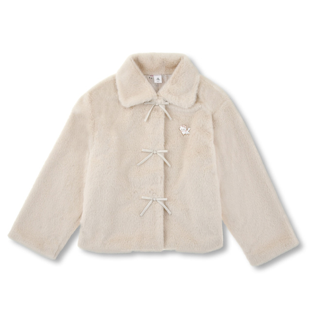 マリーのブローチがアクセントになっている「ブルゾン」は、やわらかな手触りのフェイクファーを贅沢に使用し、レトロでクラシックな雰囲気に。フロントのリボン飾り、内生地のビンテージ感のあるキャラクターアートなど見どころも多い。