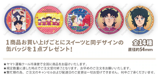 「プリケーキ」、「プリマカロン」ともに、特典として缶バッジが付くのもファンには嬉しいところ。「プリケーキ」は購入したケーキと同じデザイン、「プリマカロン」は選んだデザインのものを、1点を購入ごとに1つもらえる。見ても食べても美味しい、推しキャラクターで彩られたスイーツとともに楽しいバレンタインを過ごしたい。