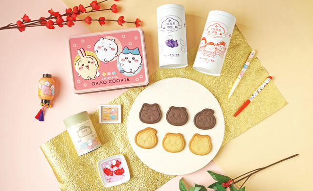 そのほか、店舗共通や京都伏見店限定の新商品も販売。ちいかわ・ハチワレ・うさぎの、表情豊かなおかお型クッキーは、プレーン味とココア味がそれぞれ6枚ずつ、かわいい缶に入っている。