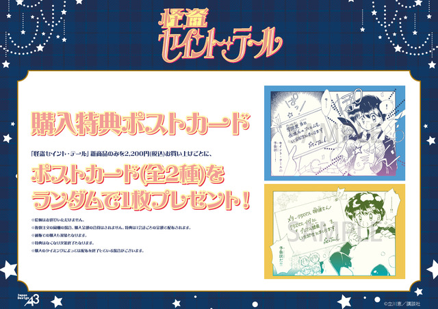 『怪盗セイント・テール』新商品のみを1会計2,200円(税込)お買い上げごとに、購入特典としてポストカード(全2種)をランダムで1枚プレゼント。“予告状風デザイン”がキュートな、ここでしか手に入らない限定品となっている。お気に入りのグッズとあわせて、ぜひゲットしたい。(※特典はなくなり次第終了)