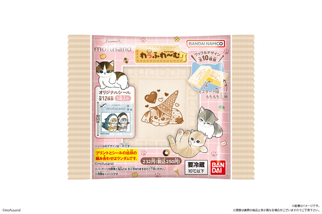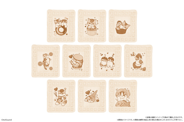 そんな「mofusand」から、今回「mofusand わっふれ~む」が登場。ワッフルの凹凸を生かしてフレームに見立てたもちもち生地の表面に、高精細なデザインをプリントした、カスタード味のクリーム入りワッフルだ。ワッフルには、スイーツをモチーフにした全10種類のにゃんこのイラストがプリント。