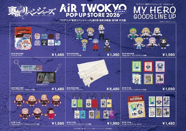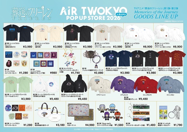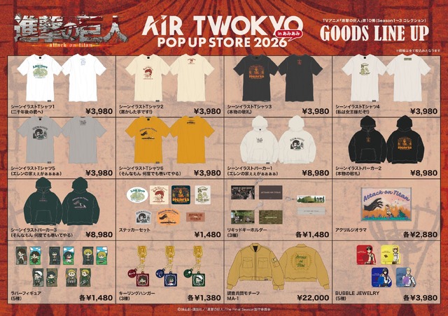 『進撃の巨人』、『葬送のフリーレン』、『東京リベンジャーズ』、『ゴジラ』などの人気作品のグッズがラインナップされる「AIR TWOKYO POP UP STORE 2026 in あみあみ」が、2026年2月13日から3月1日にかけてホビーショップ「あみあみ池袋miniフェアグッズ店」にて開催される。アパレルや雑貨が多数登場するもので、先着でノベルティグッズのプレゼントも行われる。