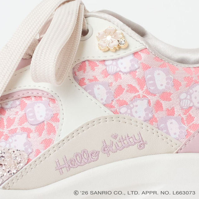 「西陣織コートスニーカー」は、和の繊細さとハローキティの愛らしさをひとつにした、心ときめくデザイン。ビジューがちょこんと添えられ、桜モチーフスタッズが高級感をプラスする。