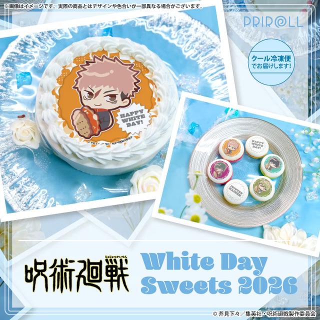 アニメ『呪術廻戦』のキャラクターがあしらわれた「PRIROLL(プリロール)」によるホワイトデースイーツは税込みで、「ホワイトデープリケーキ2026」が各5,130円、「ホワイトデープリマカロン6個セット2026」が2,754円。なお、ホワイトデー当日の3月14日着指定の注文はすでに締め切られているので留意しておきたい。詳細は各商品ページまで。