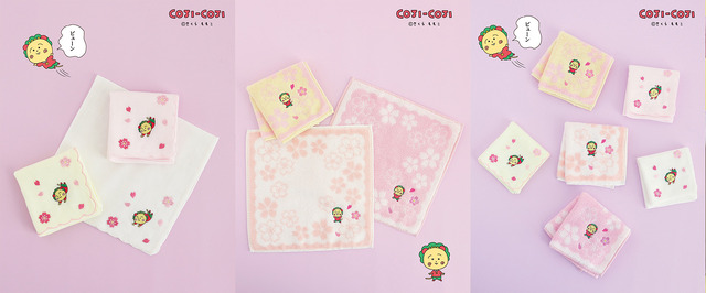 桜シリーズより、 「ガーゼハンカチ(桜の花びらとコジコジ刺繍)」「タオルハンカチ(満開桜とコジコジ)」は、満開の桜の花の中で元気いっぱいに春の訪れを喜んでいるコジコジがアクセントになっている。