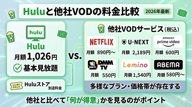 この記事では、Huluの料金プランの詳細から、無料で見る方法、支払い方法、他社VODとの料金比較、よくある質問まで2026年最新情報で徹底解説します。