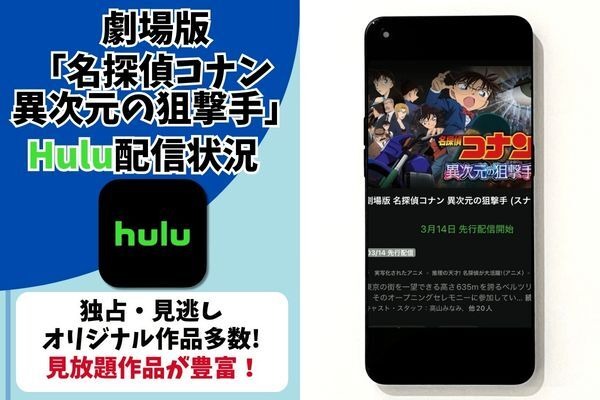 劇場版『名探偵コナン 異次元の狙撃手(スナイパー)』を配信で視聴するなら、3月14日から見放題配信されるHuluがおすすめです。▶︎Huluの月額料金や無料で視聴する方法はこちらで解説しています。