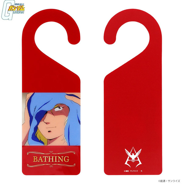 また、バスタイムを彩る専用のドアプレートも付属。こちらは表面の文字を金箔でプリントしており、裏面にはシャアのパーソナルマークがデザインされている。