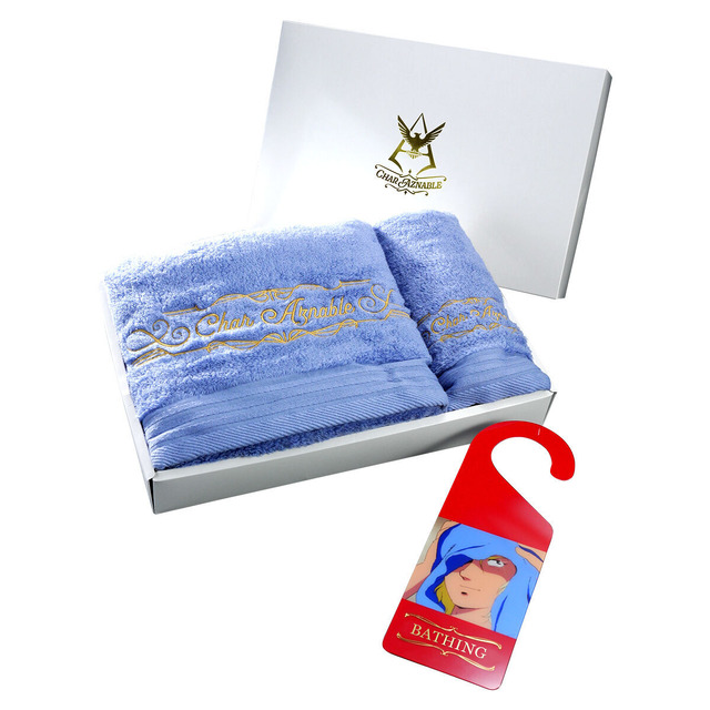 無撚糸の中でも特に細い糸を使用した綿本来のやわらかい肌触りが特徴で、パイルに艶がある生地に金糸でオリジナル刺繍が施されている。