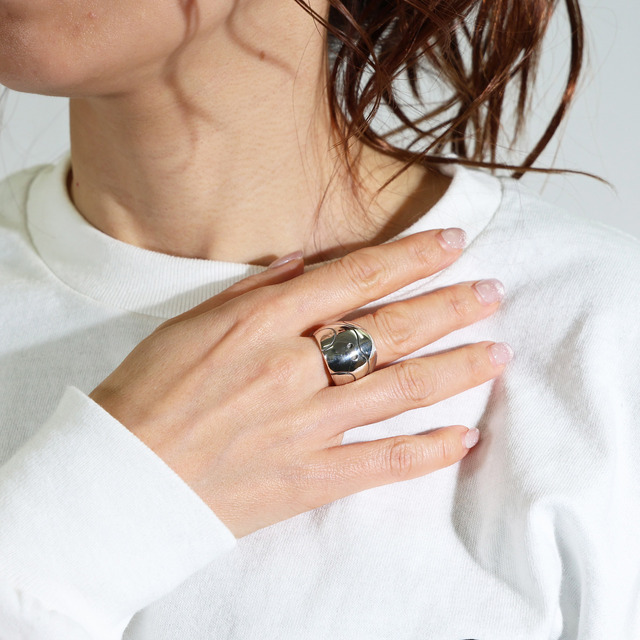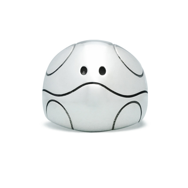 本コレクションでは、「ハロ」の設定画を参考に細部の造形やバランスを丹念に研究し、アクセサリーとしての再現性を追求したもの。リングでは、特徴的な目と口のディテールをシャープに仕上げることで、愛らしさの中にメカニカルな存在感を表現している。