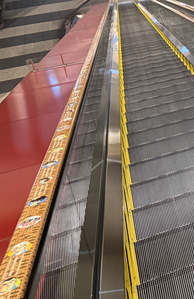 展開中のタイアップ装飾のうち、横浜みなとみらいエリアではみなとみらい駅改札の地下から地上まで、クイーンズスクエア横浜の約82mの長ロングなエスカレーター3基の手すりに注目だ。