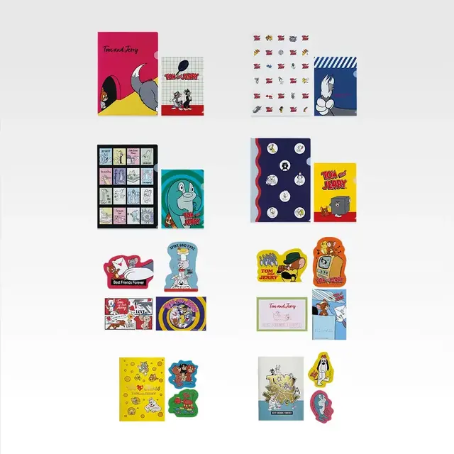 J賞「アートステーショナリー」は、大小のクリアファイルセット4種、ポストカード4枚セット2種、ミニノートとステッカー2枚付き2種の、合計8種から好きなアイテムが選べる。トムとジェリーだけでなく、登場キャラクターをたっぷり使ったカラフルなデザインが魅力のアイテムとなっている。