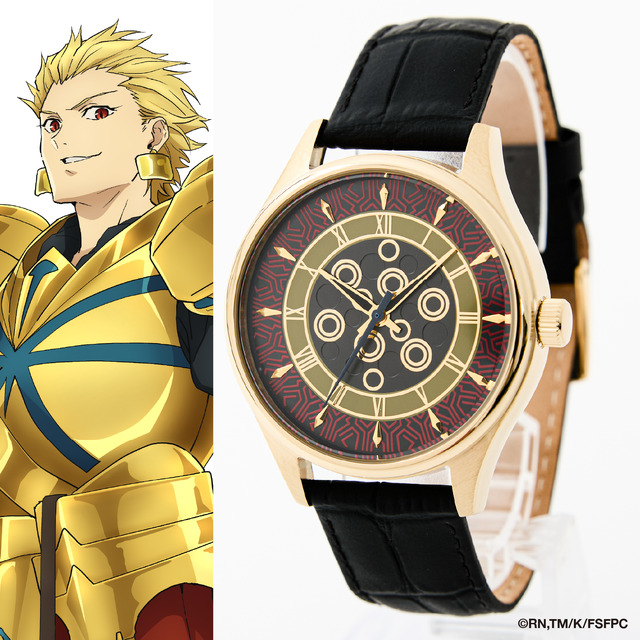 腕時計の盤面中央に「王の財宝<ゲート・オブ・バビロン>」をイメージしたエッチングを施し、インデックスや金属パーツで宝具が放たれる様を演出した。