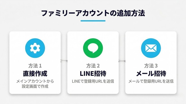 ファミリーアカウントの追加方法は「直接作成」「LINE招待」「メール招待」の3パターンから選べます。