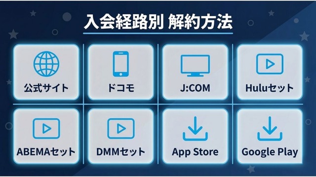 ここでは、全8ルートとAmazon経由を加えた計9パターンの解約手順をそれぞれ紹介していきます。